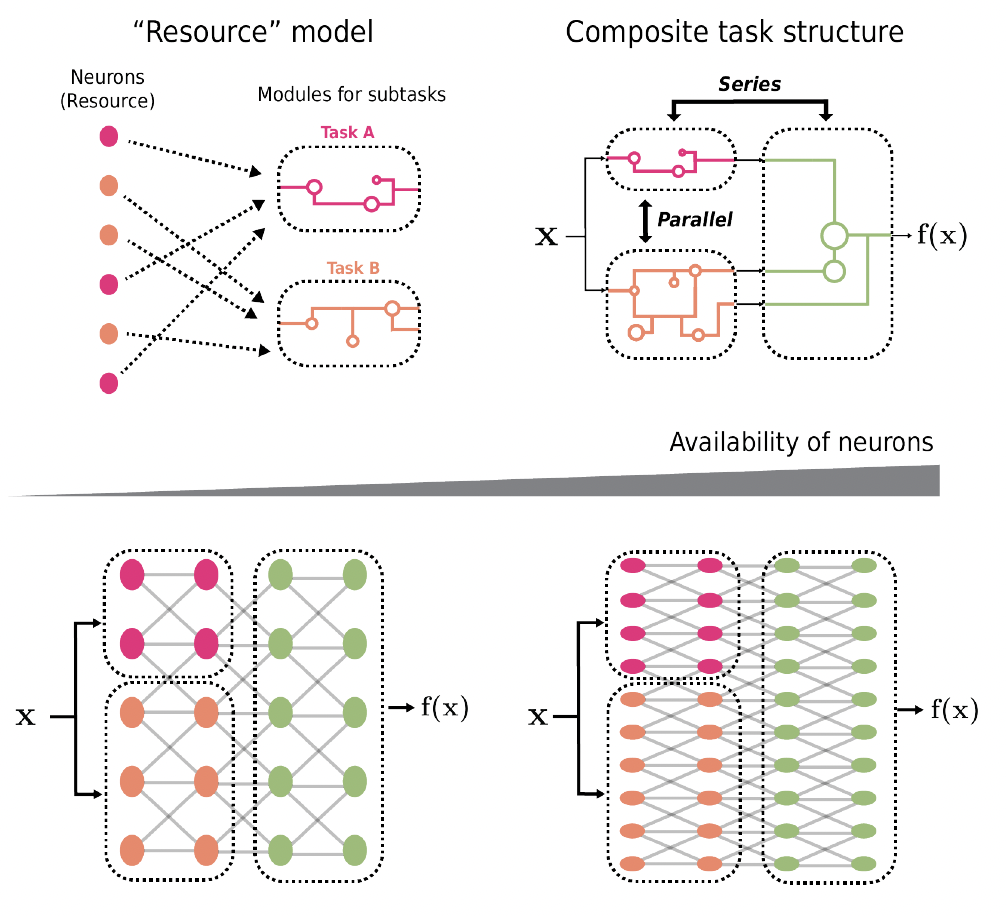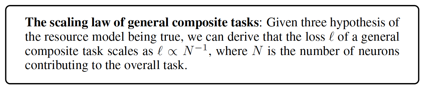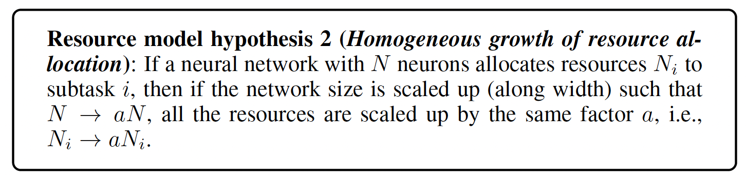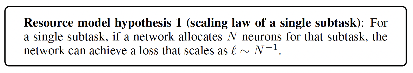 On the other hand, it is unknown why such a law occurs and holds across various tasks, including language, vision, and even proteins. Previously, in our workshop paper at ICLR 2024, “A RESOURCE MODEL FOR NEURAL SCALING LAWS”, we propose the “resource model” as a phenomenological model to explain the scaling laws of large language models (LLMs). Resource model hypotheses are as follows.